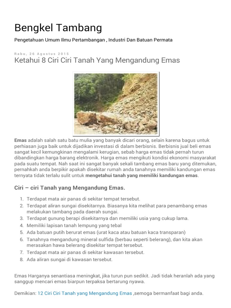 Ayo kenali material tanah yang berhubungan dengan keberadaan emas. Berikut ini adalah cara untuk mengetahui ciri tanah mengandung emas : Cara mengetahuii sungai yg memiliki kadar emas nya. Terdapat gunung berapi disekitarnya dan memiliki usia yang cukup lama. Memiliki lapisan tanah lempung yang tebal. Jenis batu yang mengandung emas batu emas tambang emas. Ciri ciri tanah yang mengandung emas dan proses pengambilannya.tanah atau gunung yang mengandung emas sering ditemukan pendaratan pinggir sungai yang datar d. 12 ciri ciri tanah yang mengandung emas. Umumnya berkadar emas tinggi sampai bonansa Ciri ciri gunung mengandung emas. Jenis batu yang mengandung emas batu emas tambang emas. #emas #kadaremas #batumengandungemas #gold #tambang #tambangemas #hargaemas Suatu ketika, seorang lelaki yang sedang berusaha mencari emas di sebuah terowongan menemui ajalnya karena terowongan tersebut runtuh.